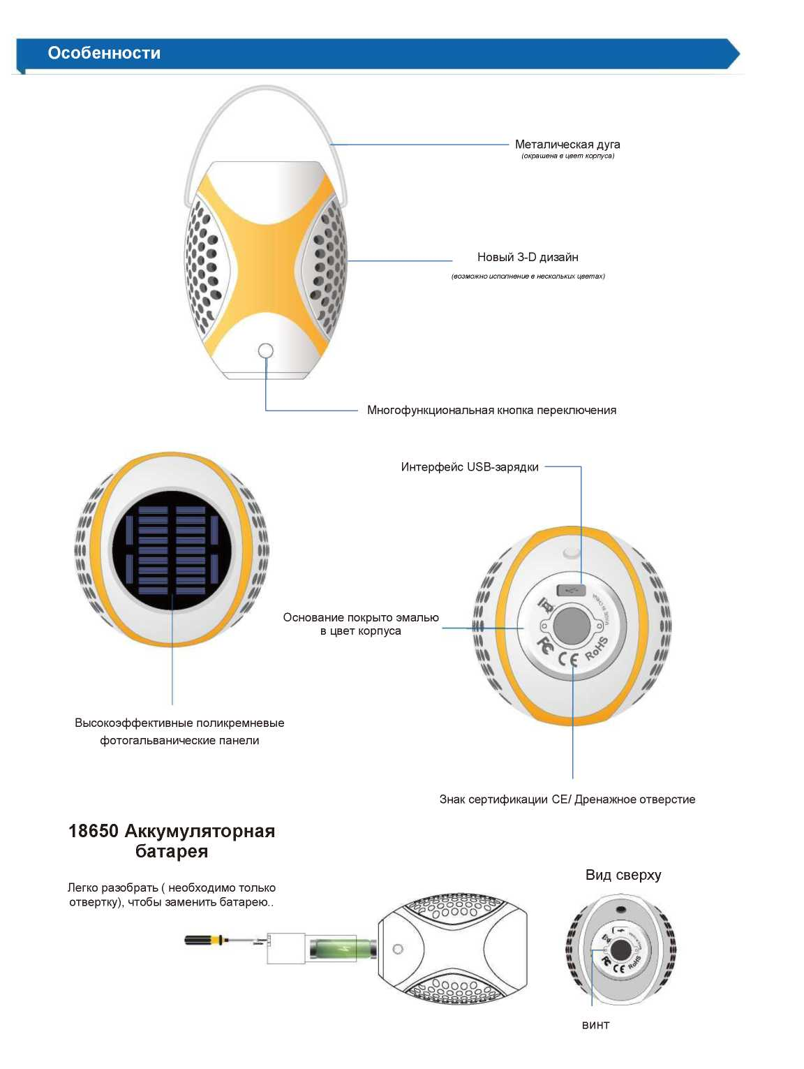 В дождливую погоду или когда нет солнечного света, для зарядки батареи вы можете использовать кабель МikгоUSВ 2.0 и зарядное устройство для лампы.